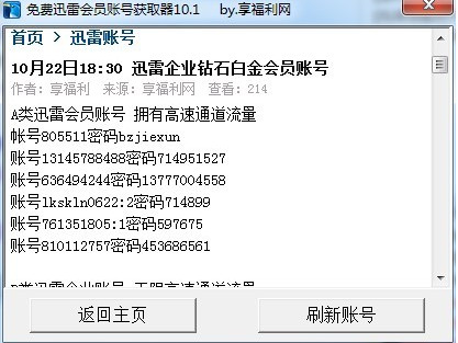 享福利网免费迅雷会员账号获取器是一款很不错的辅助软件,该款软件是一个免费共享迅雷会员账号的软件,有迅雷会员账号后能够有效解决大家在下载资源中出现缓慢或没资源速度的问题.,此工具完全免费,账号每天更新,本款软件绿色安全,可放心使用,赶快试试吧!