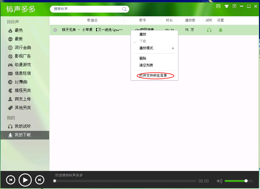 4、选择所下的铃声点击右键选择【打开文件所在目录】即可看到我所有的下载的铃声的文件了,这时候你就可以直接使用这些铃声了