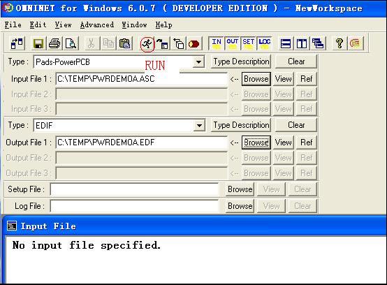 2.启动程序Omninet for Windows,输入文件类型(Type)选Pads-PowerPCB,Input File 1里用Browse指定网络表文件的位置。