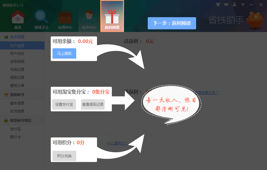 当您通过省钱助手产生了收益时,省钱助手会自动提醒您,省去了您频繁查看的烦恼。