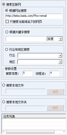 158邮件地址搜索专家集成了按网址搜索、按关键字搜索,支持对互联网、本地目录和本地具体文件的搜索。您可以选择搜索某一网址下所有网页中出现的Email地址,也可以通过关键字,借助百度、Google等流行的搜索圣手搜索相关的Email,支持HTML、ASP、PHP、ASPX、SHTML、JSP等多种后缀名称的网页的网页检索。