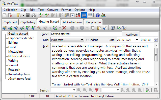 AceText是一款强大的文本管理软件,它可以快速进行文字编辑,编程,搜索,收集信息,发送、回复电子邮件,聊天等操作,简化并加速你的日常工作,是你的工作更具效率。该文本管理器已经整合了注册信息,无需注册,没任何时间和功能限制,下载后直接安装即可。