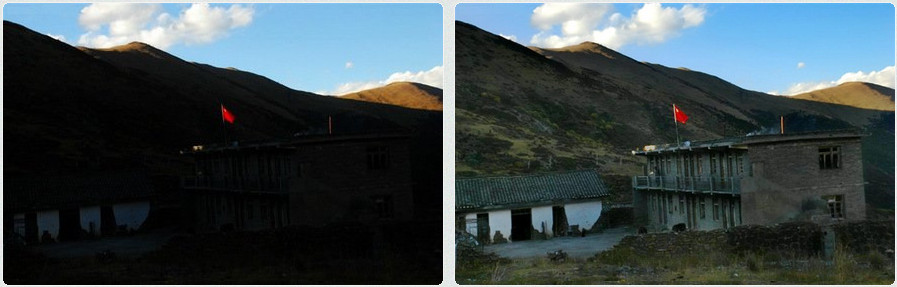 1. 明暗层次不失真:图例在大幅提亮了暗区(山峦、房屋)的情况下,保持亮区(蓝天白云)毫不失真。