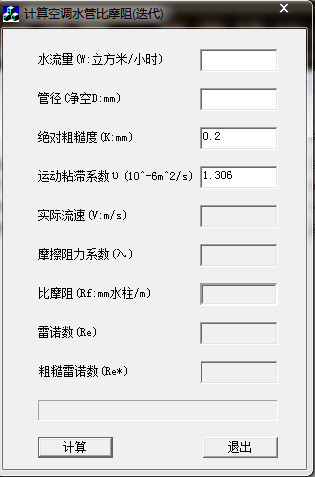 空调水管比摩阻计算器是一款功能齐全的好软件,是为相关从业人员量身定做的一款计算辅助软件,是一款不可多得的好软件,这款软件具有计算实际流速、摩擦阻力系数、比摩阻、雷诺数、粗糙雷诺数的功能,这款软件能够同时兼容多种强大功能,用户在使用之时只需输入相关数据点击“计算”即可,本款软件绿色安全,完全可放心使用,有兴趣的小伙伴们千万不要错过哦!