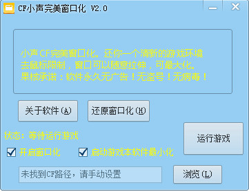 小声CF完美窗口化(完美CF窗口化做到去除鼠标限制)是一款功能齐全的好软件,是一款穿越火线窗口化工具,是一款不可多得的好软件,支持可大可小设置,这款软件能够同时兼容多种强大功能,进入游戏后自动开启窗口化功能,本款软件绿色安全,完全可放心使用,有兴趣的小伙伴们千万不要错过哦!