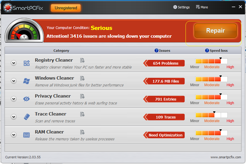 清理上网垃圾软件 SmartPCFix Pro 会扫描你的电脑的不必要的注册表和垃圾文件。它清除从您的PC和互联网浏览器的垃圾和杂乱,腾出宝贵的硬盘空间。还删除的恶意软件文件残余在注册表中留下的。