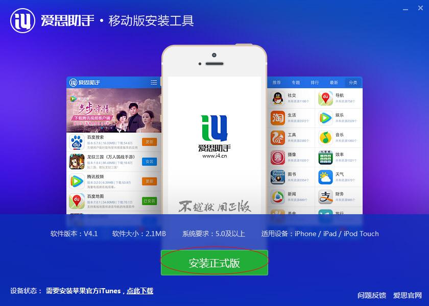 爱思助手移动版安装工具是一个用来在电脑端一键安装爱思助手移动版的软件。爱思助手移动版是一款免费的第三方苹果应用商店,适用于没有苹果账号或嫌输入帐号麻烦的用户,极速下载,解决中国网络很难连接App Store的问题。