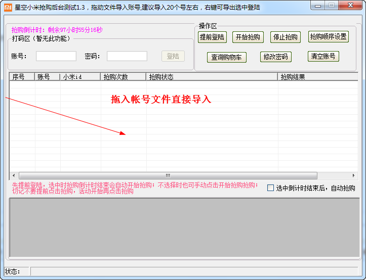 小米后台抢购软件好多,但大多是收费的,这款是免费软件,可支持拖入文件导入账号批量抢,右键可导出选中的号码登录。建议导入20个号左右。