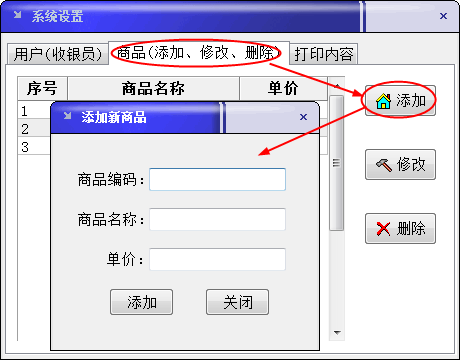 第四步:在“商品(添加、修改、删除)”界面上添加商品信息。关闭“系统设置”窗口,返回软件主界面。