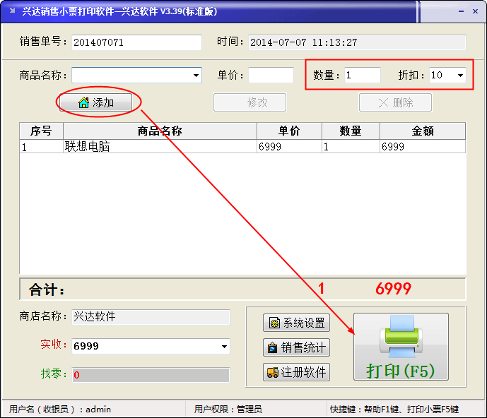 第五步:在软件主界面上,添加要打印的商品信息,包括商品名称、单价、数量、折扣。添加完毕后,点击“打印(F5)”按钮或直接按“F5”键进行销售小票打印。