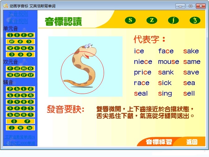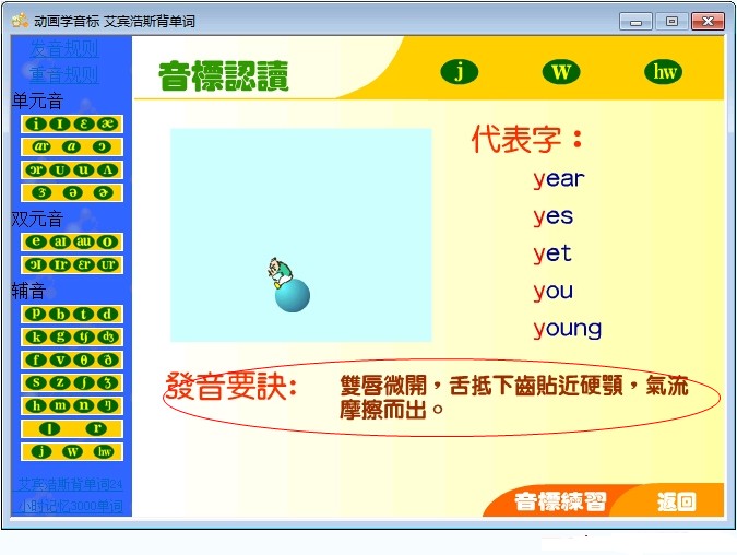 动画学音标是一款英语音标学习辅助软件,可以帮助客户快速掌握单元音、双元音和辅音,并有相应的音标练习题供各位学习者练习,让你快速学会认读英语音标。本工具采用鼠标点击操作,操作区域在软件的右上方和左侧以及右下方!