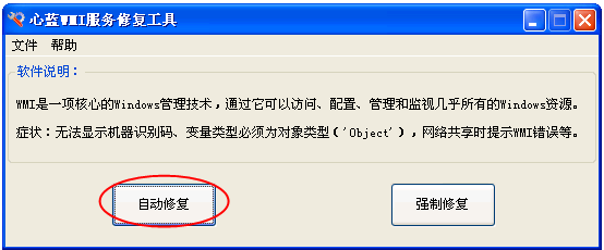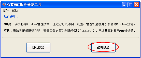 WMI修复工具(心蓝WMI修复工具)主要提供两种修复方法,一种是自动修复,一种是强制修复
