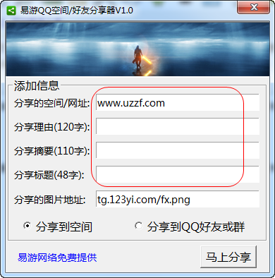 易游QQ空间好友分享器是一款绿色免费的qq空间分享工具,使用者通过本软件能够简单的将各种信息在QQ空间中进行推广,是做网络营销的好帮手,软件的使用也非常的便利。