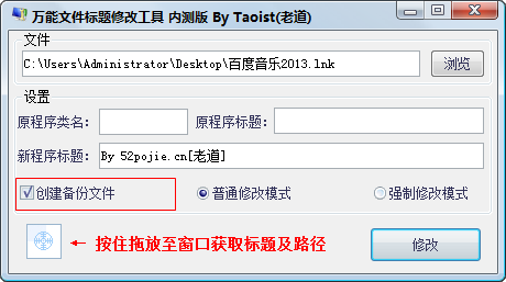 万能文件标题修改工具是一款小巧实用的软件标题修改工具,可以修改任意软件或是文件的窗口显示标题,软件分为普通修改和强制修改两种模式,可以用来修改替换成个性的软件或是文件标题。