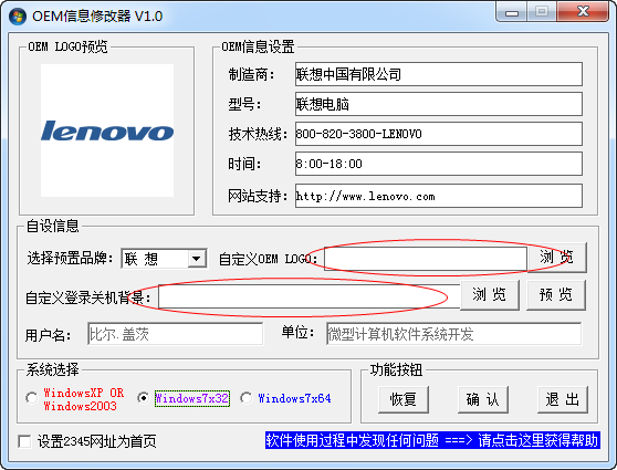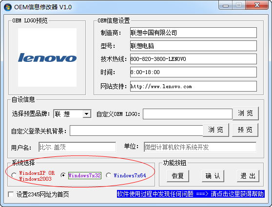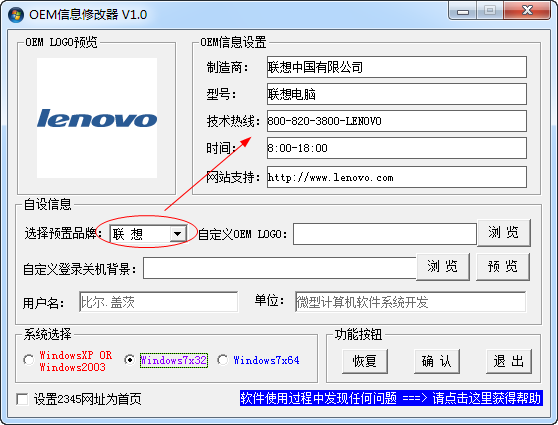 4、设置完成后点击“确认”按钮进行修改;如果要恢复为默认的OEM信息,点击“恢复”按钮即可。