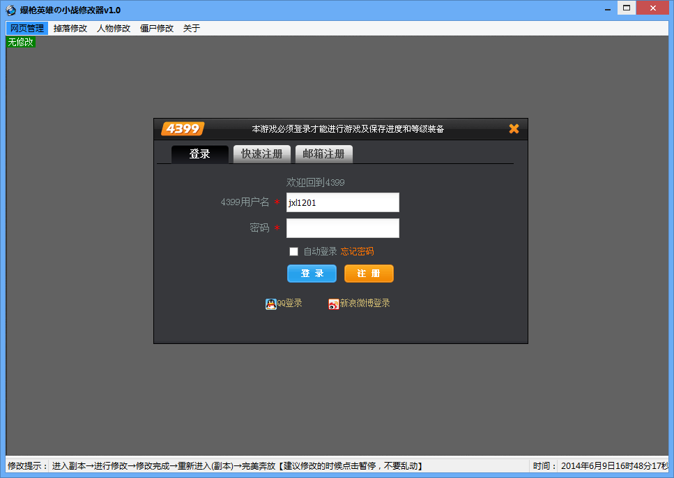 1、双击启动爆枪英雄小战修改器,使用4399账号登陆游戏。