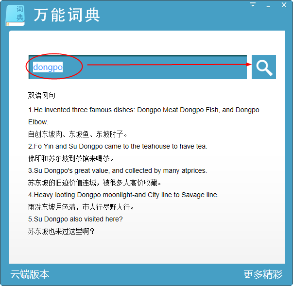 2、查询结果会显示在下面,会显示该英语单词对应的汉字和双语例句。