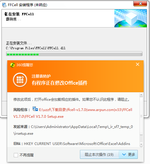 安装过程中安全软件会提示修改Office插件,选择“允许所有操作”即可。