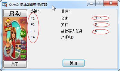 欢乐汉堡店2修改器是一款功能全面的好软件,是一款同名下的游戏辅助工具,非常实用,是一款不可多得的好软件,是大神级玩家自己制作的游戏辅助工具哦,这款软件能够同时兼容多种强大功能,有四项修改功能,玩家可以通过辅助来得到金钱,时间等,让你轻松玩游戏,本款软件绿色安全,完全可放心实用,有兴趣的小伙伴们千万不要错过哦!