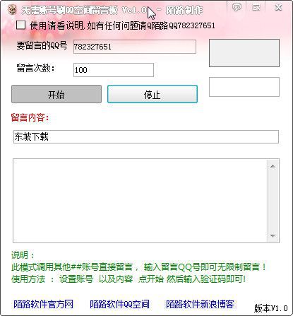 无需帐号刷QQ空间留言板是一款支持刷qq空间留言板的工具,无需小号即可实现。绿色软件免安装,解压即用。只需要填上要留言的qq号和留言的次数,点击开始即可。