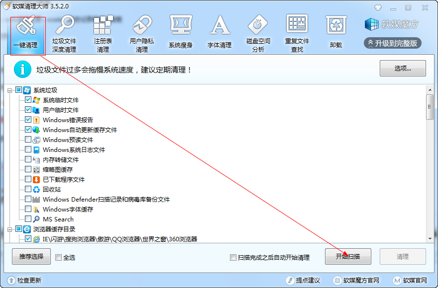 3.一键清理工具会自动扫描系统垃圾文件,点击【开始扫描】就行了