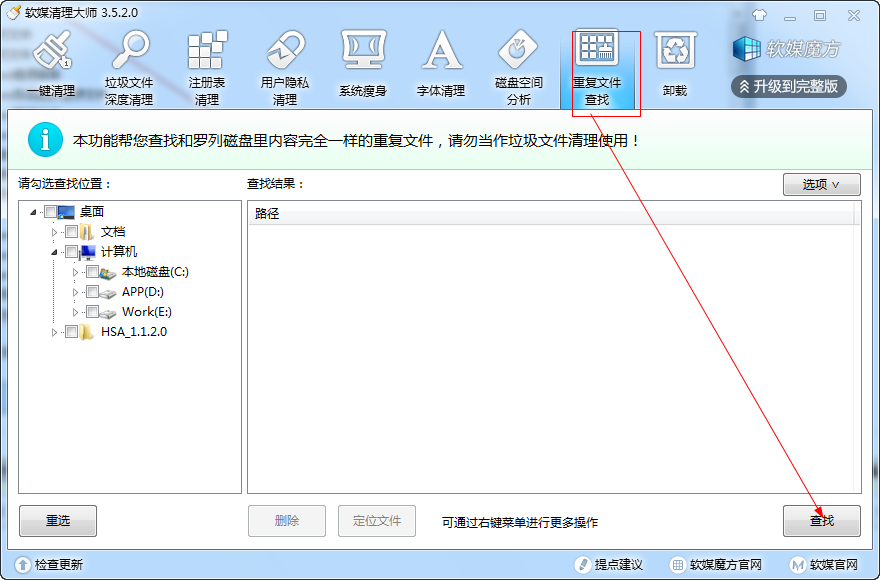 4.重复文件查找可以有效的帮助系统瘦身,点击【查找】就行了