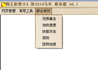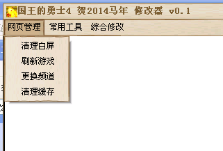 国王的勇士4 贺2014马年修改器是一个多功能的同名游戏辅助工具,主要分为网页管理,常用工具,综合修改等项目。本修改器适用于:4399国王的勇士4,3366国王的勇士4,灵动国王的勇士4。