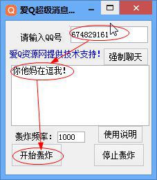 爱q超级消息轰炸工具(qq消息轰炸器)是一款非常完美的qq辅助软件,是一个强大的多功能工具,是一款qq消息轰炸的神器,有四个QQ小功能:QQ信息轰炸、QQ在线查看,强制聊天,查QQ秀,本款软件操作简单,使用方便,绿色安全,喜欢的朋友赶快试试吧!