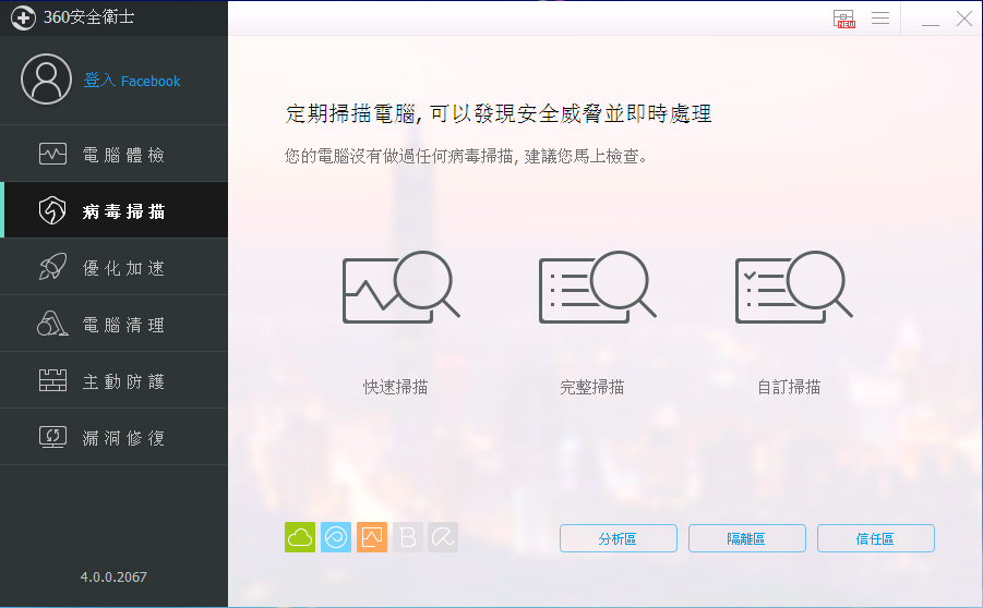 定期的对电脑病毒扫描可以及时发现威胁以便马上处理,包括:快速扫描,完整扫描,自定义扫描