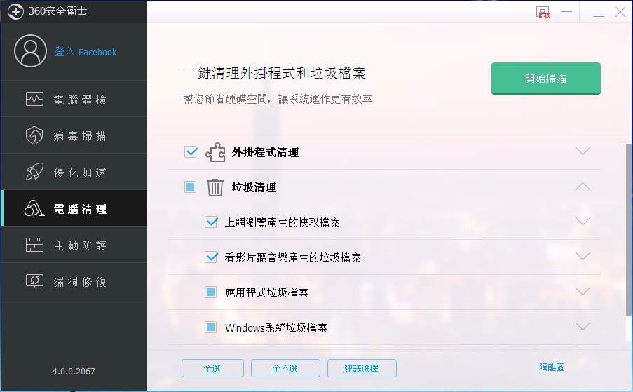清理系统后帮您节省硬盘空间,让系统运行更有效率,主要包括外挂程序清理与垃圾清理。
