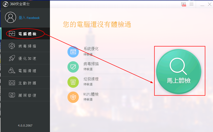 包括:系统优化检查,病毒扫描、垃圾清理、wifi体检