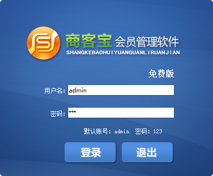 2、安装完成后启动商客宝会员管理系统,默认账号admin,默认密码123