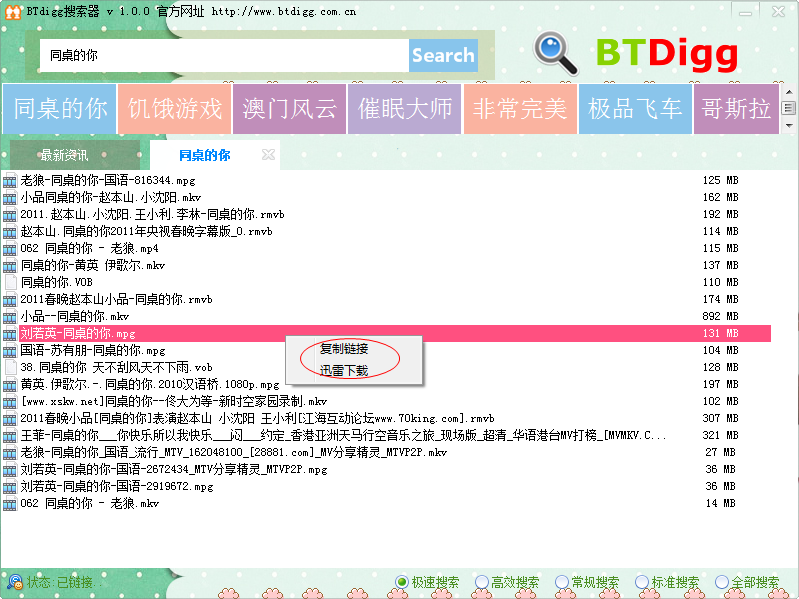 btdigg搜索器是一款小巧的互联网资源搜索工具,基于先进的P2P搜索技术,可在瞬间搜索全球bt网络资源,简单便捷的搜索到bt网络上共享的海量音影娱乐、学习资料等资源。搜索出来的资源可以用电驴或者迅雷下载工具下载,非常方便。