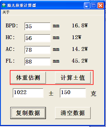 胎儿体重计算器采用Hodlock 公式计算,并计算上下浮动值及估测孕周,方便机器没内置公式的朋友使用!