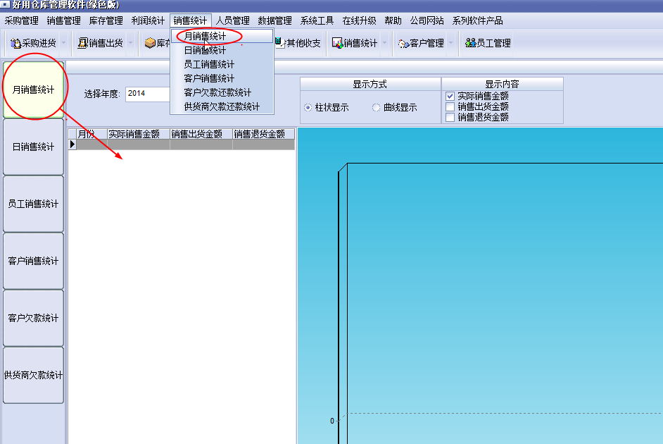 6.当你不知道销售怎么弄的,可以试着点击下【销售统计】,小编点击的是【月销售设计】,这样就可以看到关于月销售设计的一个画面,然后再这个里面看这个月的销售情况。