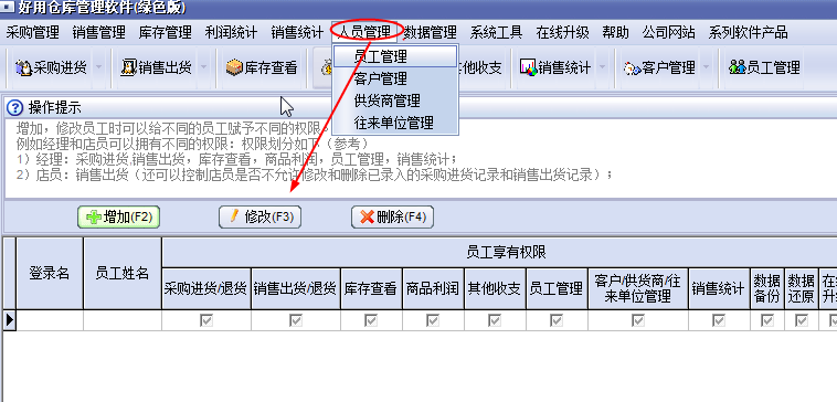 7.如果不知道怎么人员给怎么管理算方便?可以点开【人员管理】,【员工管理】来了解情况。想要修改和增加,可以点击【增加】,【修改】。其余的也是类似。