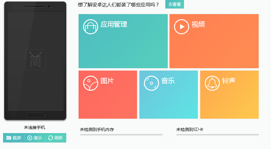 支持各种主流安卓机型,照片、视频、音乐,一键轻松管理。并有专业小编定期为用户精心挑选最优质的安卓应用,所有内容均经过人工严格筛选,确保应用绿色、优质、安全,让你轻松玩转安卓手机。
