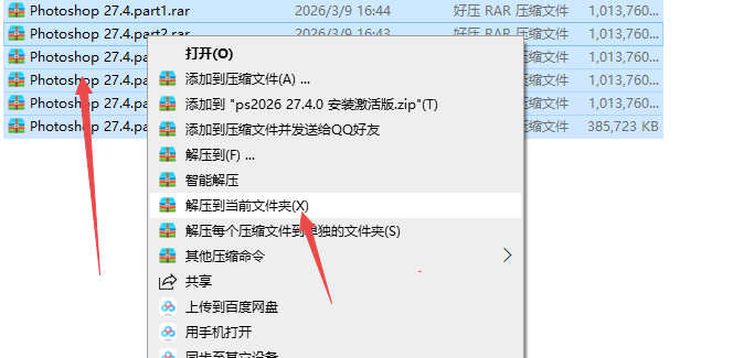 2、全选压缩包然后选择解压到当前文件夹