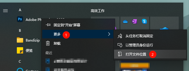 1、开始菜单,PhotoShop右键-更多-打开文件位置
