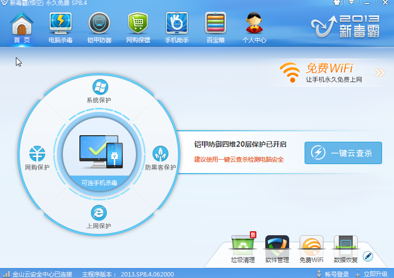新毒霸悟空是金山毒霸的升级版,其实这款杀毒软件安装规律来是该叫金山毒霸2014,但是大家肯定很奇怪的是为什么要叫悟空呢?其实关于悟空大家都知道,神通广大,关键的他还有一双火眼金睛,可以看清任何的妖怪,其实用在软件名字也是一样的,就是看清算很多病毒,然后再去杀掉,还不留情的,想来这也是金山公司为取这个名的由来吧,而今天给大家介绍的开发版的,就是说这软件还在不断的在完善,他更能让网友们放心的使用。
