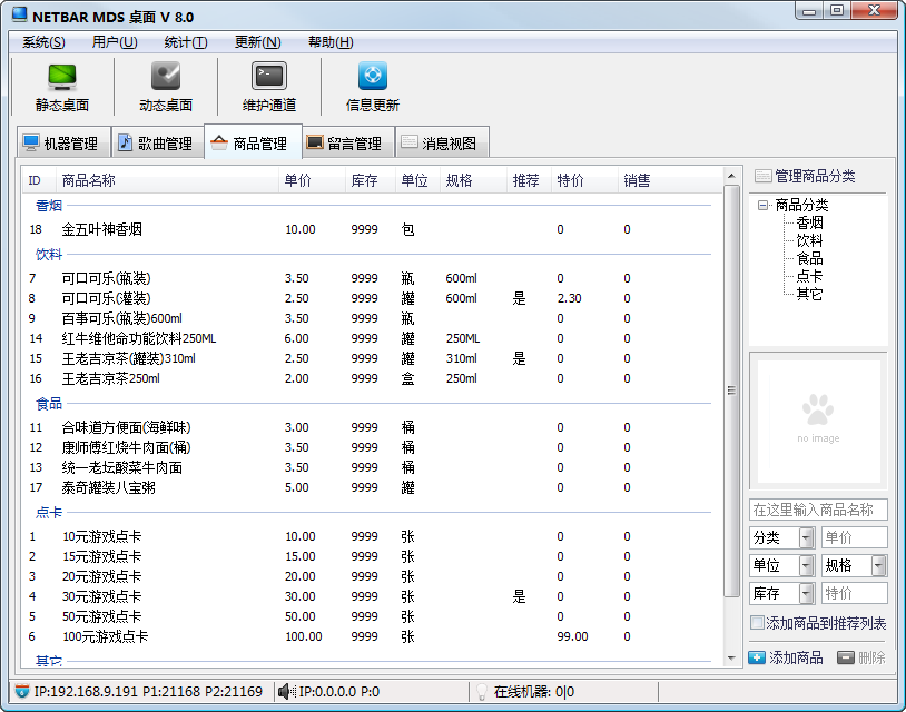 【服务端】服务端软件安装在网管电脑上,具有机器管理、歌曲管理、商品管理、留言管理、消息视图等功能;