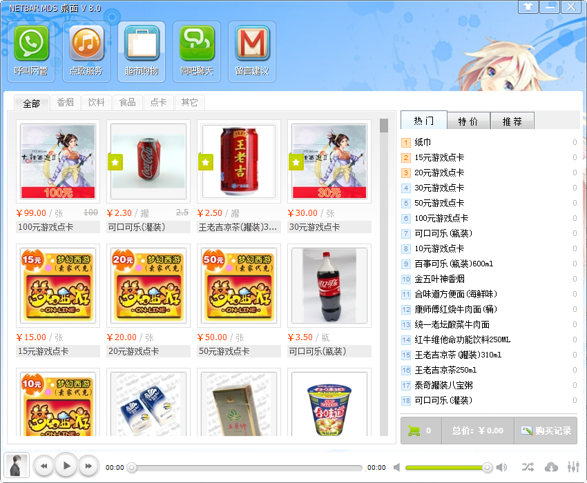 点歌平台、呼叫网管、商品销售、定时播音等。在提供桌面美化的同时,这些全方面服务软件将为管理员解放双手,并大大节省网吧的人力开支和改善玩家互动,在零成本的前提下通过提升网吧的服务质量,同时也就将提高网吧的竞争优势。