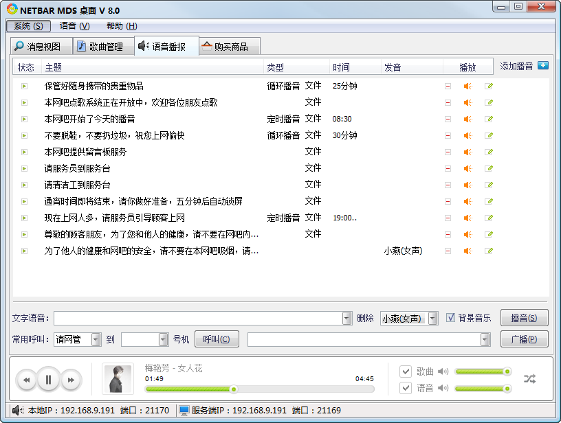 【语音端】语音端用于为网吧的语音播报提供服务,包括歌曲播放、语音播报、购买商品提示等。