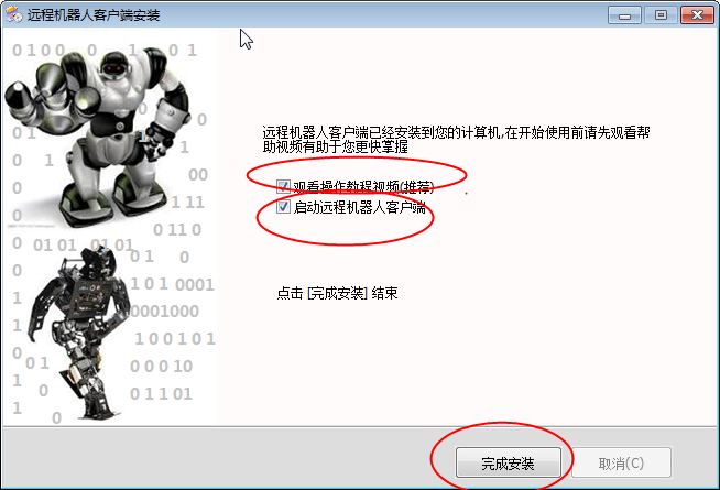 2.安装之后,会出现的下面这个界面,如果对自己的自信的可以选择看视频教程,没有那多时间看的,选择启动远程机器人客户端,然后点击【完成安装】