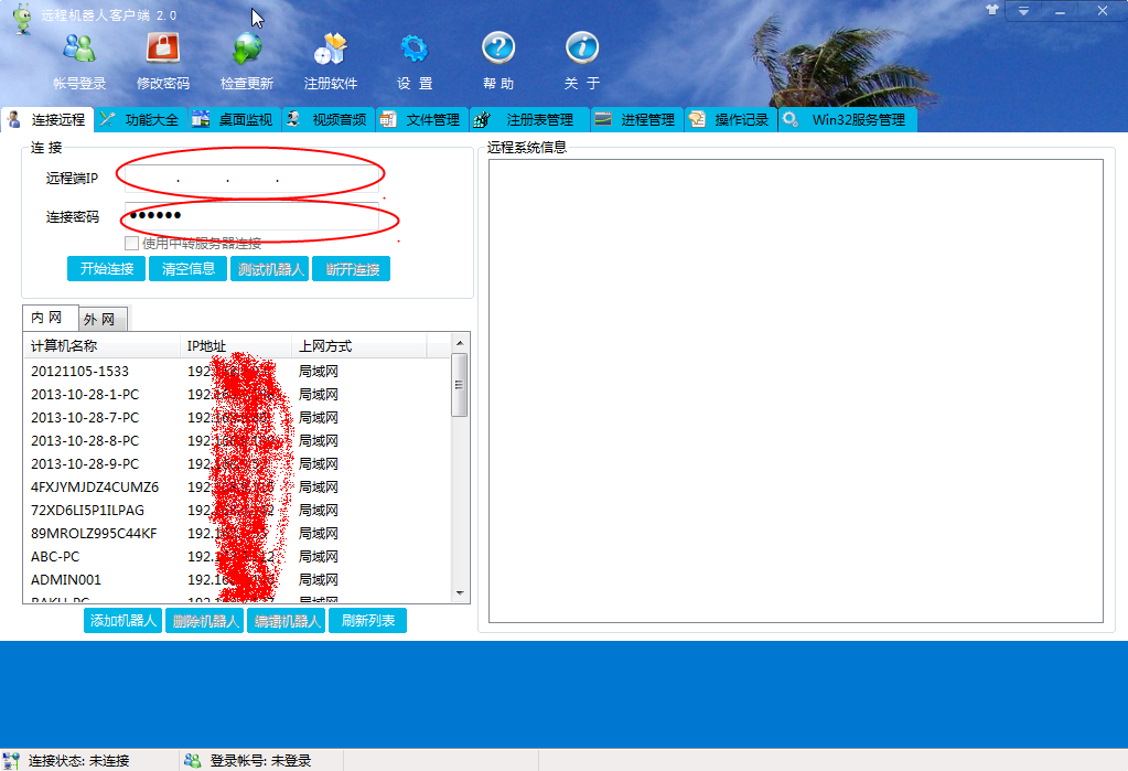 远程机器人是一款能在远处监控你的电脑的程序软件,他的应用包括家人来监控不听话上网的孩子,防止他的孩子在玩电脑的时候,不节制,影响以后的学习,对于老板来说,就是监控员工是不是在上班的时候使用电脑来经行一些与公司无关的事情,别以为听说远程监控就是个很烦,有复杂的事情,其实不是很困难的使用这个软件,这款软件使用就是简单。