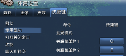 3、打开“环境设置(快捷键O)”,点击“快捷键”选项卡,选择“使用武功”,将“关联菜单栏1”和“关联菜单栏2”的快捷键分别设为键盘Q、E。(设置键盘快捷键根据自身习惯)
