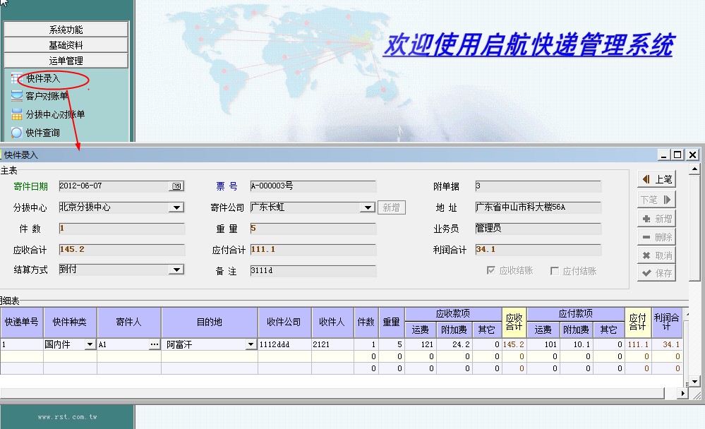 1.运单信息的录入及查询(快件类型、目的地、付款方式、应收应付款等);