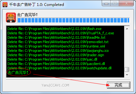 2、双击【千牛去广告补丁.exe】就会自动运行补丁,等待提示“去广告完毕”后点击【完成】即可!