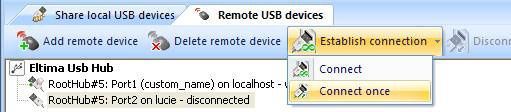 3.Remote USB Devices”界面中列出的远程设备上点击鼠标右键,选择“Connect”连接,输入前面设置的密码即可建立共享连接