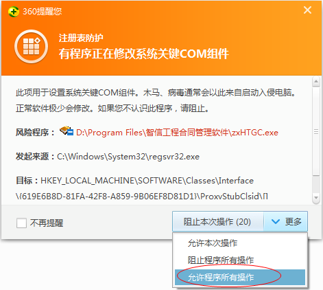 安装完成后第一次启动程序会自动注册系统组件,如果360拦截的话,请选择“允许程序所有操作”
